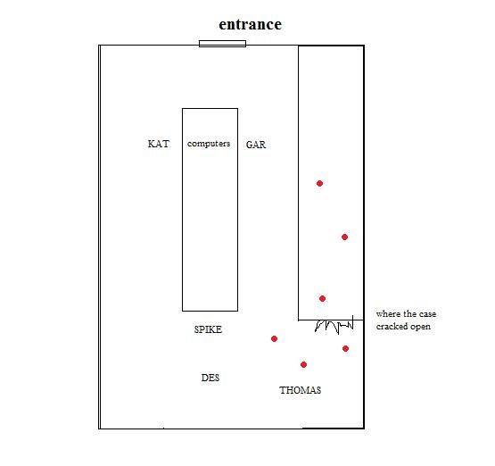 anyways here is a handy dandy map of where people at. the red dots are ZOMBEHS. and the three that have poured out of the case are all heading towards thomas because he's right there, man. they stagger to their feet, dripping goo and ... flesh. two of them try to lunge at him and he manages to step back and away even as he kicks off the suit, but he nearly backs right into the third, who slams into him (5 dmg) ]