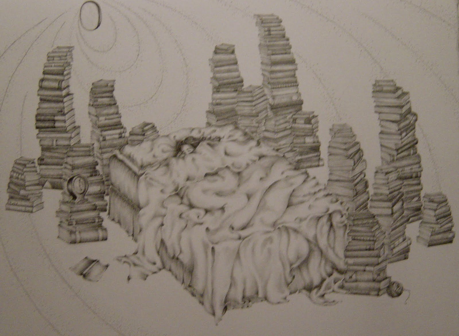 [He leads her along to his room Laying his books near a table already covered in tomes.]